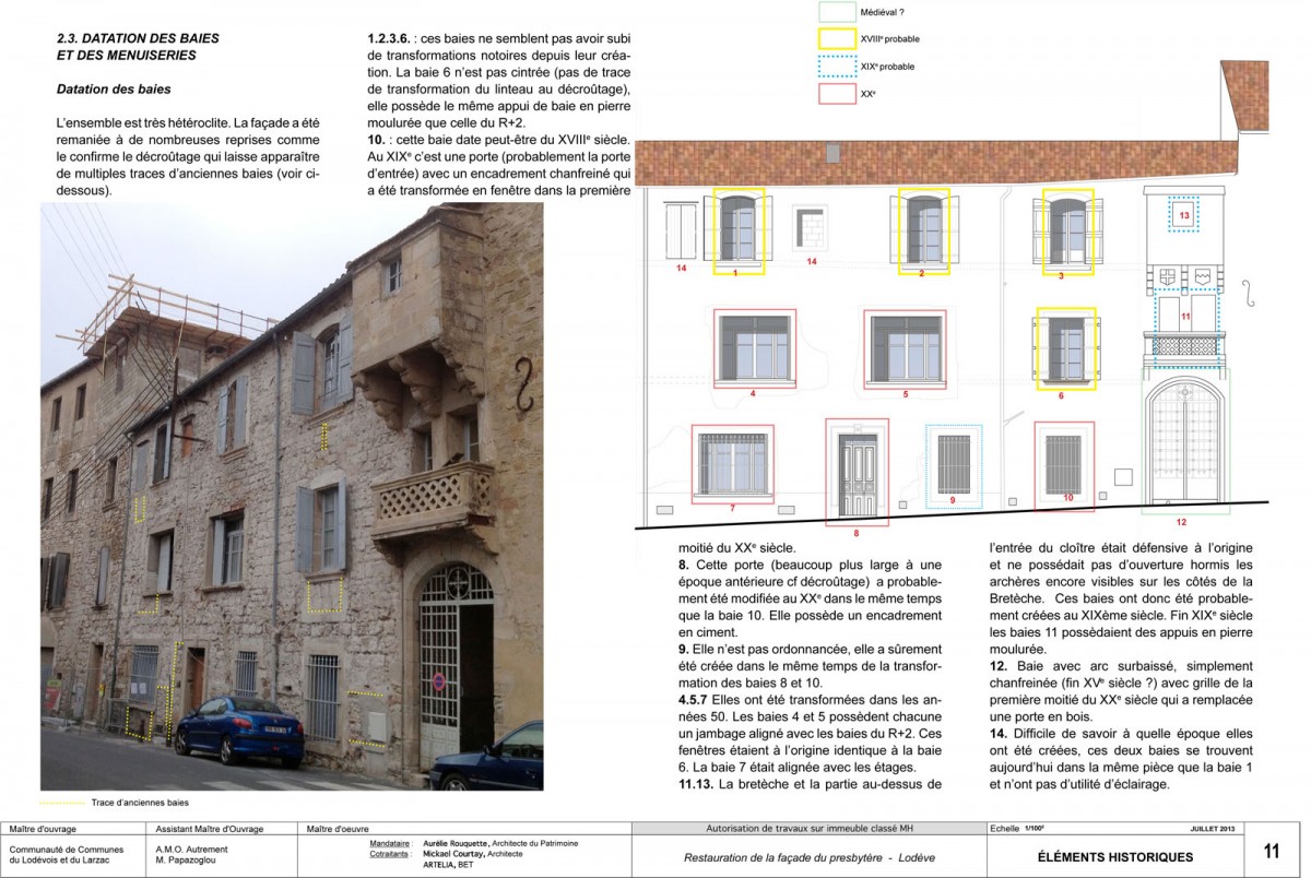 Maître d'ouvrage : Communauté de Communes du Ludévois et du Larzac - Mandataire : Aurélie Rouquette, architecte - Co-traitants : Mickaël Courtay, architecte ENSAIS / BET ARTELIA / Saboureau Ingénierie, économiste MH - Programme : restauration de la façade - Spécificité : immeuble classé MH - Mission : maîtrise d'oeuvre complète / Diagnostic patrimonial